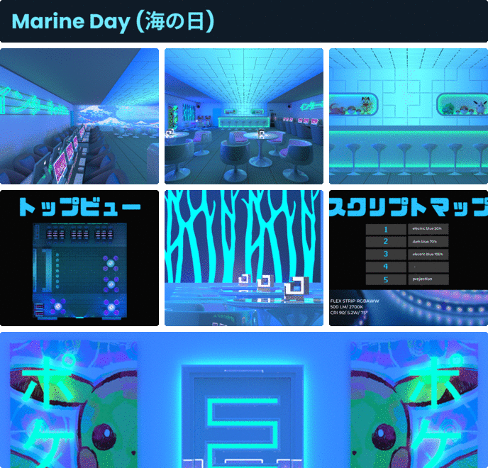 Three adaptive lighting scenarios for a Japanese cartoon-stylized Internet café.